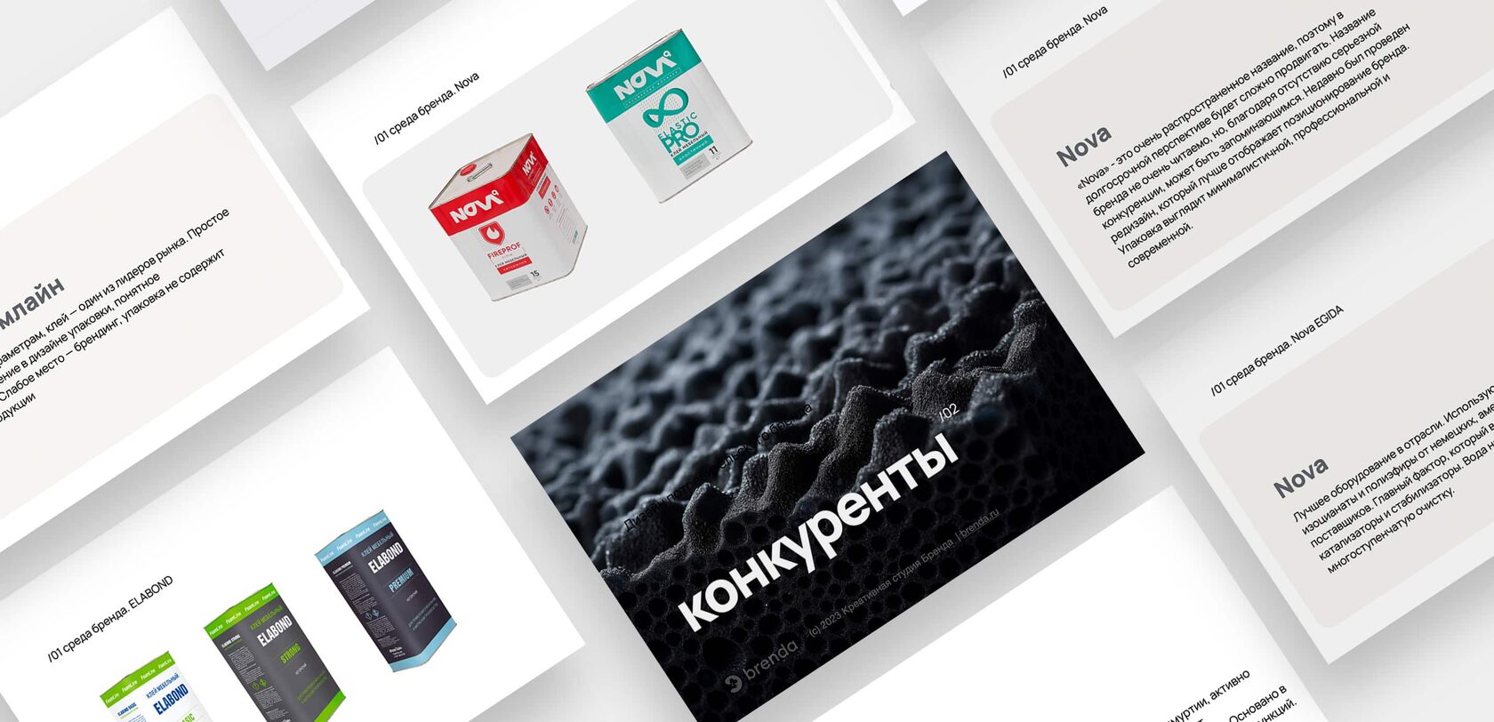 02/ Презентация с изучением конкурентов у производителя клея помогла определиться со стилем дизайна упаковки.
